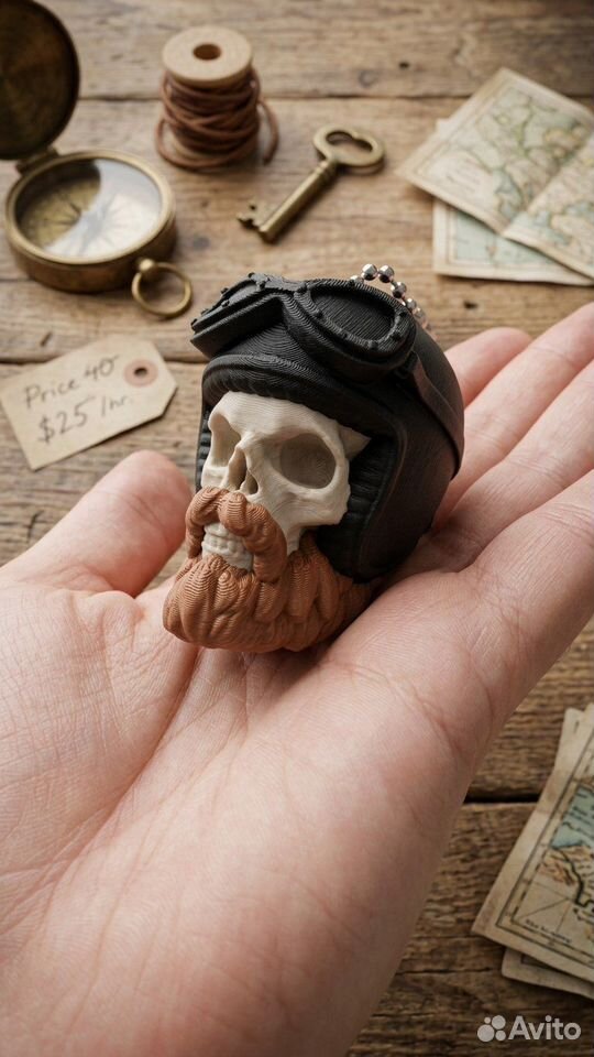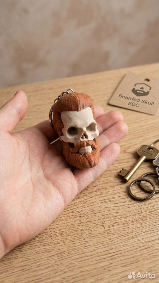 Стильные 3D‑брелоки в виде черепа с бородой. Изготовлены методом полноцветной печати: изображение и цвета являются частью структуры материала, поэтому они не сотрутся со временем и не выцветут.