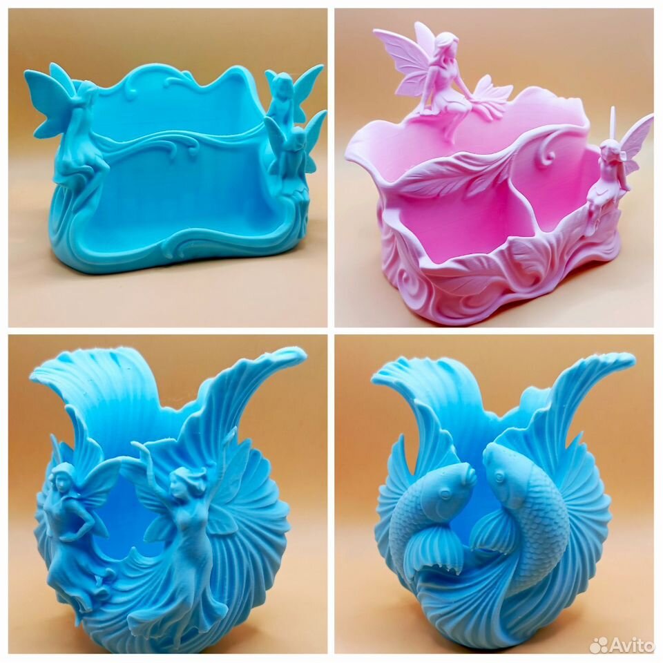 Необычные и привлекающие внимание органайзеры. Можно использовать для хранения косметики или канцелярских принадлежностей. Напечатаны на 3d принтере. Есть возможность напечатать в любом выбранном вами цвете.. Высота 9-12 см. Круглые с рыбками и феями 700р Прямоугольные 1100р Цена за одну штуку.