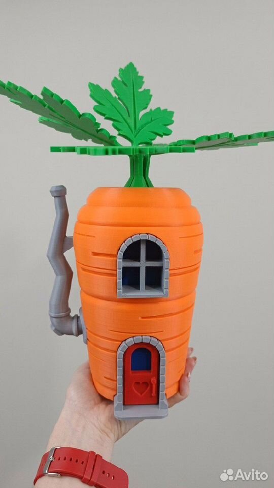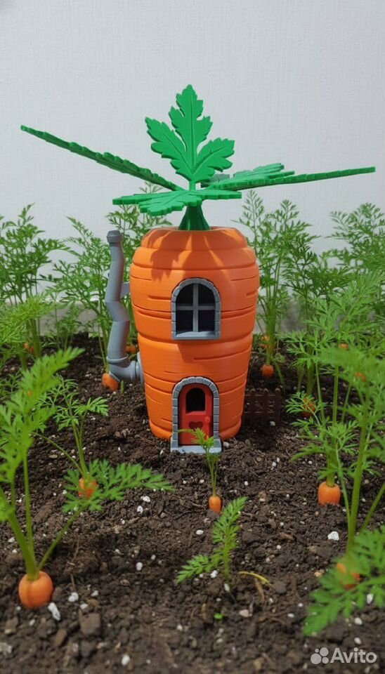Украшения для ваших грядок Морковка домик. Напечатана на 3d принтере, высота около 30 см. Колышек крепление надежно зафиксирует морковку в земле. А яркая и красочная морковка никого не оставит равнодушным. Напечатаем и другие овощи-фрукты домики для вашего сада-огорода.