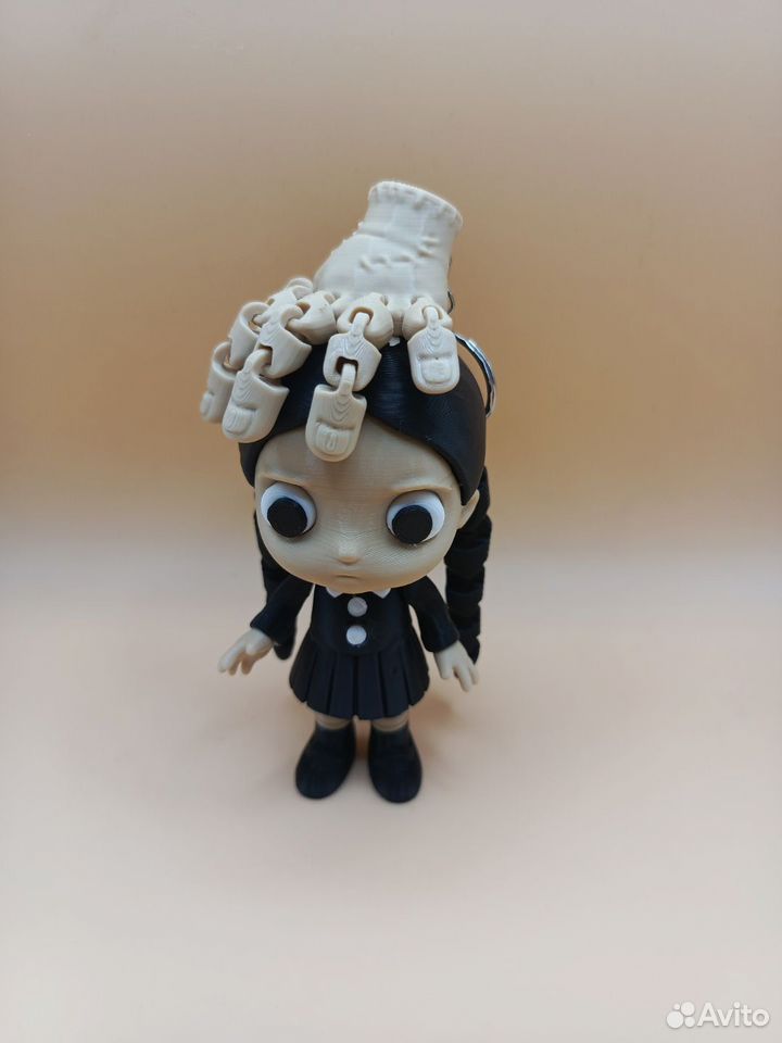 Фигурка Уэнсдей из одноимённого сериала напечатана на 3d принтере из прочного и безопасного пластика. Брелок Вещь в комплекте.