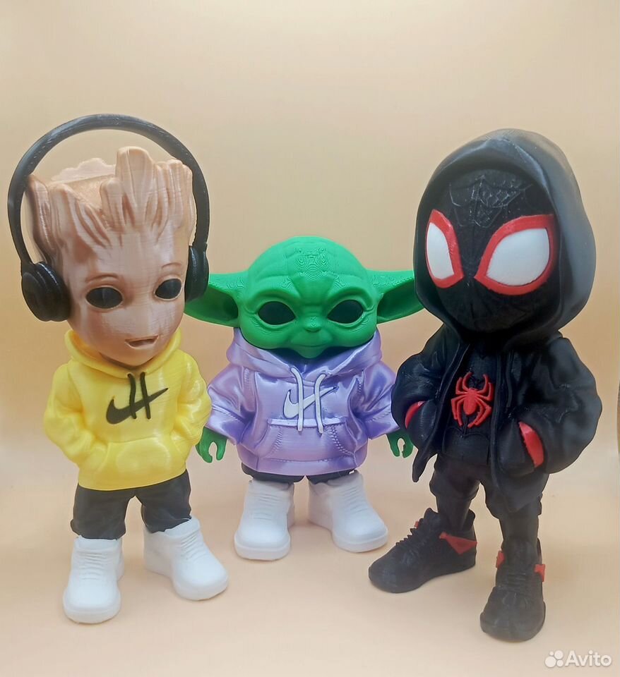 Фигурки напечатаны на 3d принтере из прочного и безопасного пластика. По вашему желанию можно изменить цвет худи, штанов и кроссовок, изменить размер фигурки. Цена за одну фигурку Йода-950р Человек-паук 17 см 1100р Грут 17 см 1100р