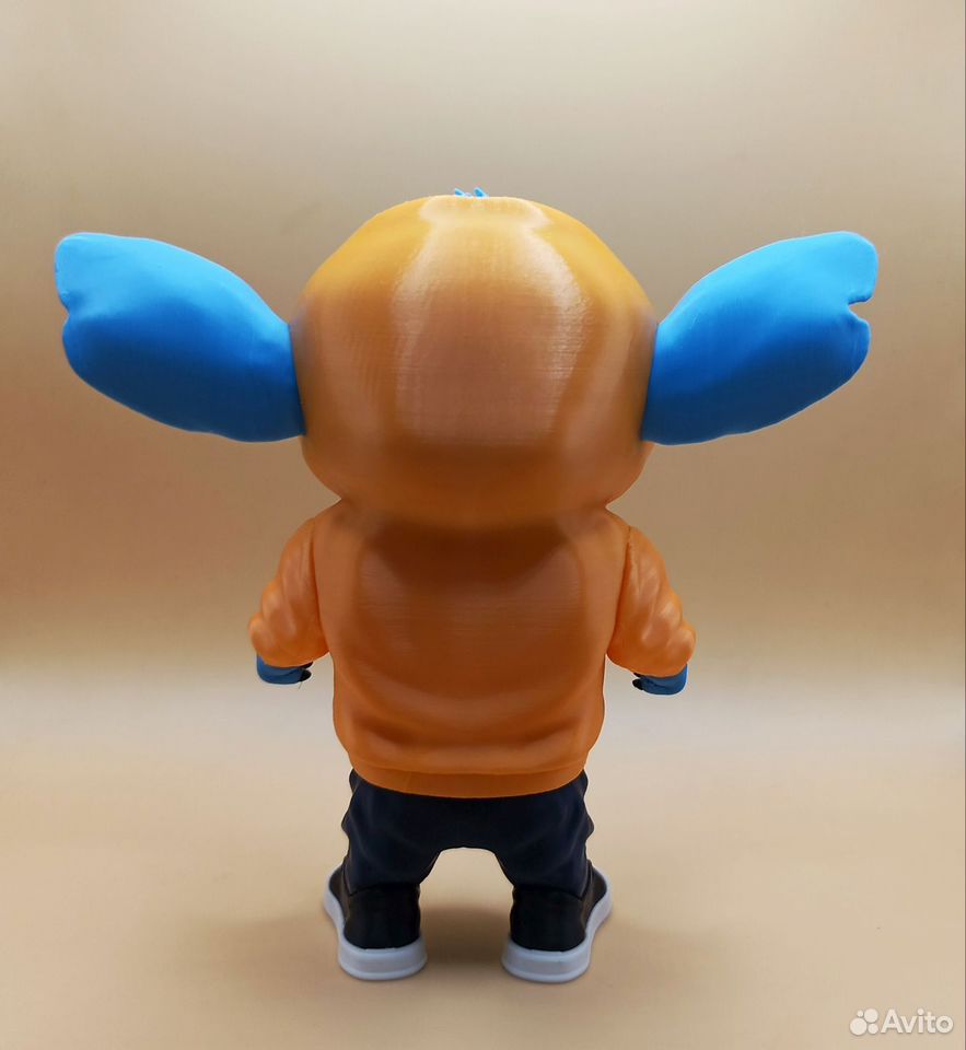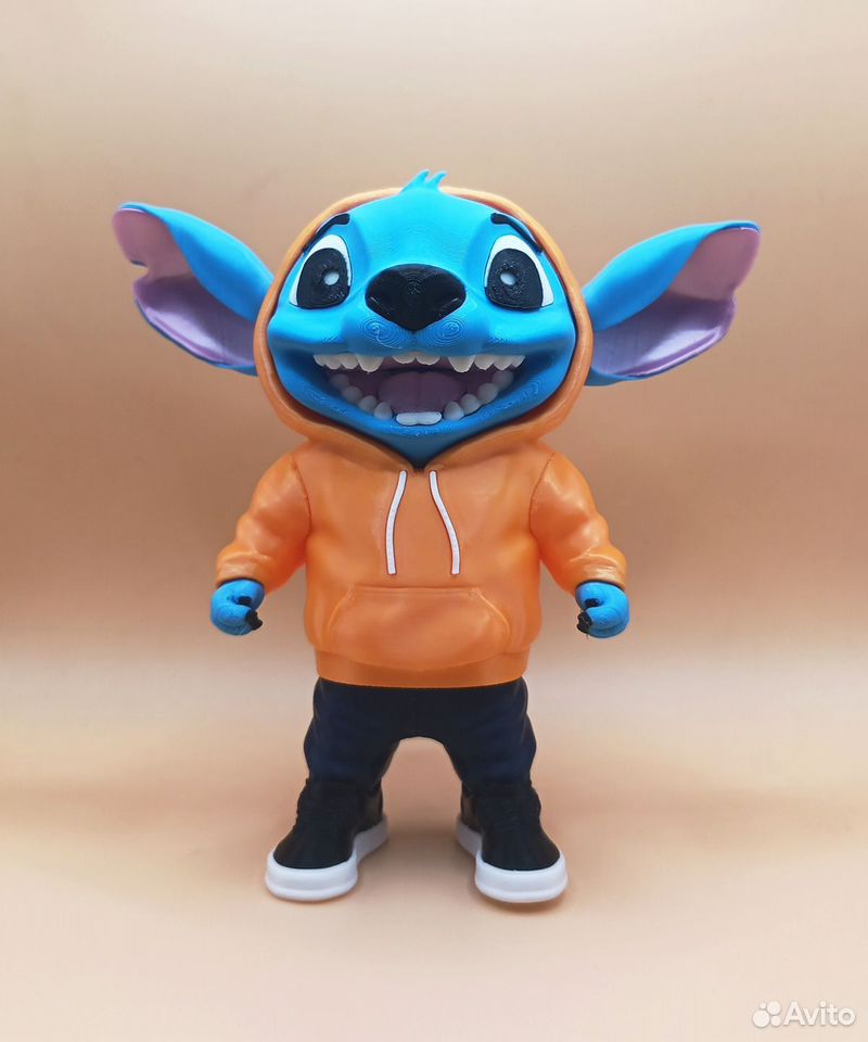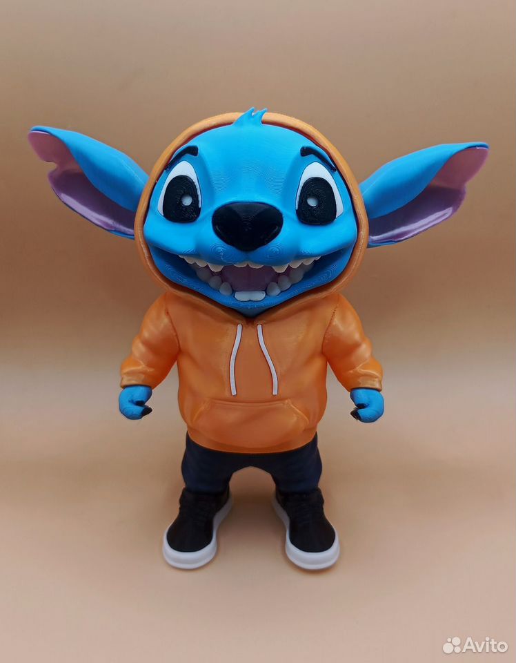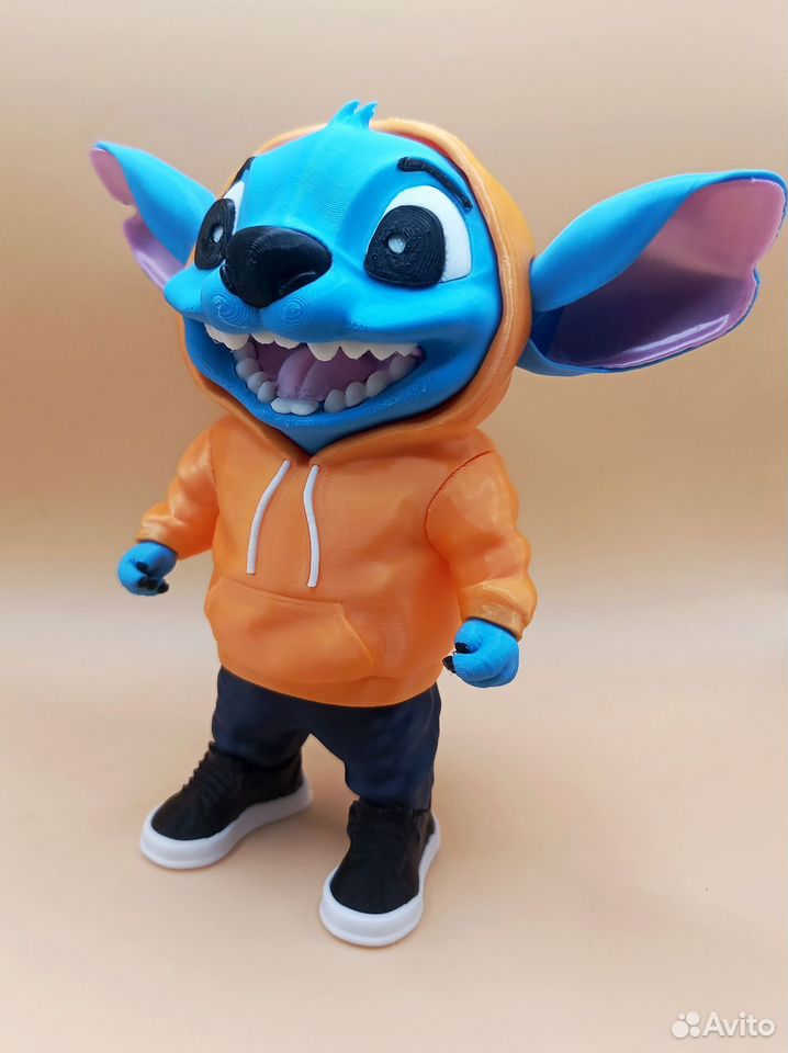 фигурка Стич с худи напечатана на 3d принтере. Худи, брюки и кроссы напечатаем в любом выбранном вами цвете. Высота 14 см.