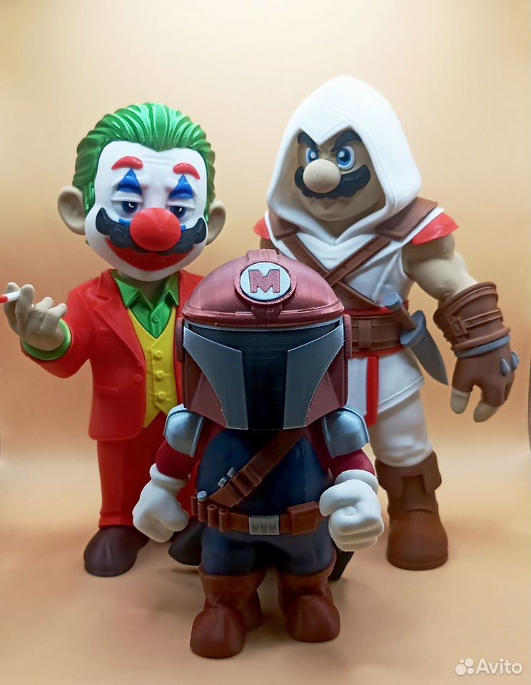 Знаменитый Марио в образе не менее знаменитых Джокера, Ассасина и Мандалорца Оригинальный подарок ценителям вселенной Высота и цена Мандалорец 15 см 1100р Ассасин 21 см 1400р Джокер 21 см 1400р Фигурки напечатаны на 3d принтере.