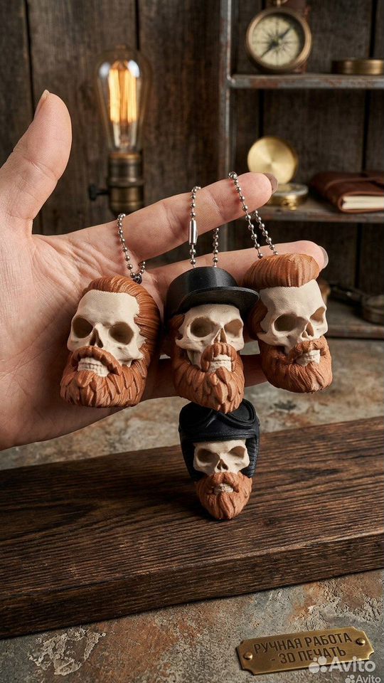 Стильные 3D‑брелоки в виде черепа с бородой. Изготовлены методом полноцветной печати: изображение и цвета являются частью структуры материала, поэтому они не сотрутся со временем и не выцветут. Отличный аксессуар для ключей, рюкзака или сумки. Можно смело мыть водой, мочить под дождем и использовать в любых погодных условиях — брелок сохранит первоначальный вид.