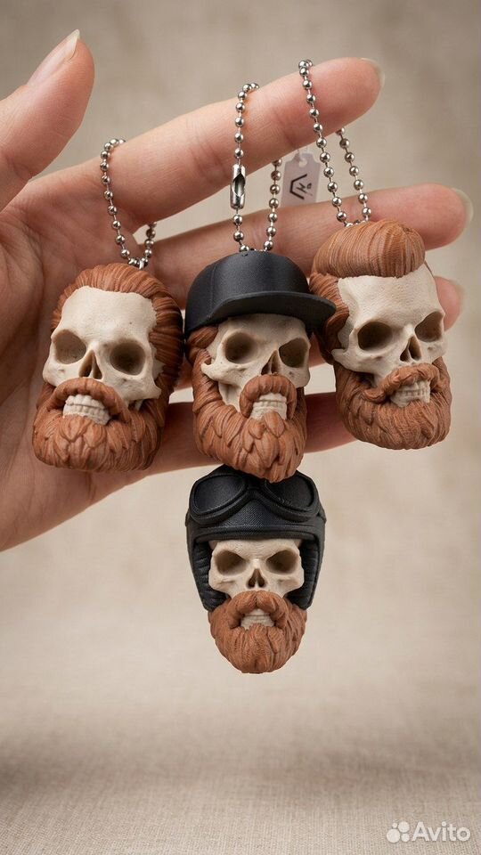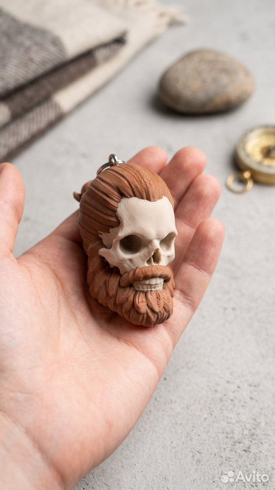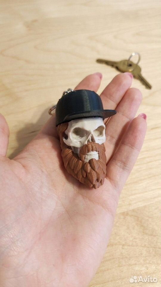 Стильные 3D‑брелоки в виде черепа с бородой. Изготовлены методом полноцветной печати: изображение и цвета являются частью структуры материала, поэтому они не сотрутся со временем и не выцветут.