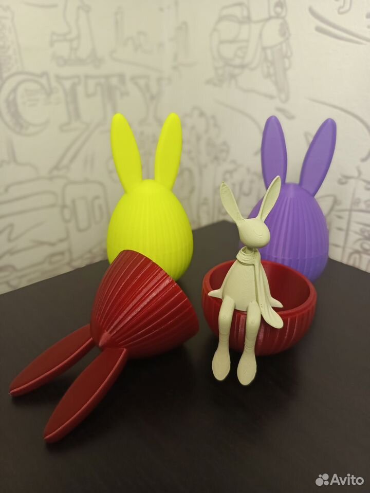 Выполнено на 3d принтере из прочного и безопасного пластика. Размер шкатулки яйца с ушками 13 см. -350 р яйцо 9 см -250 р Зайчики декоративные 16 см 450р