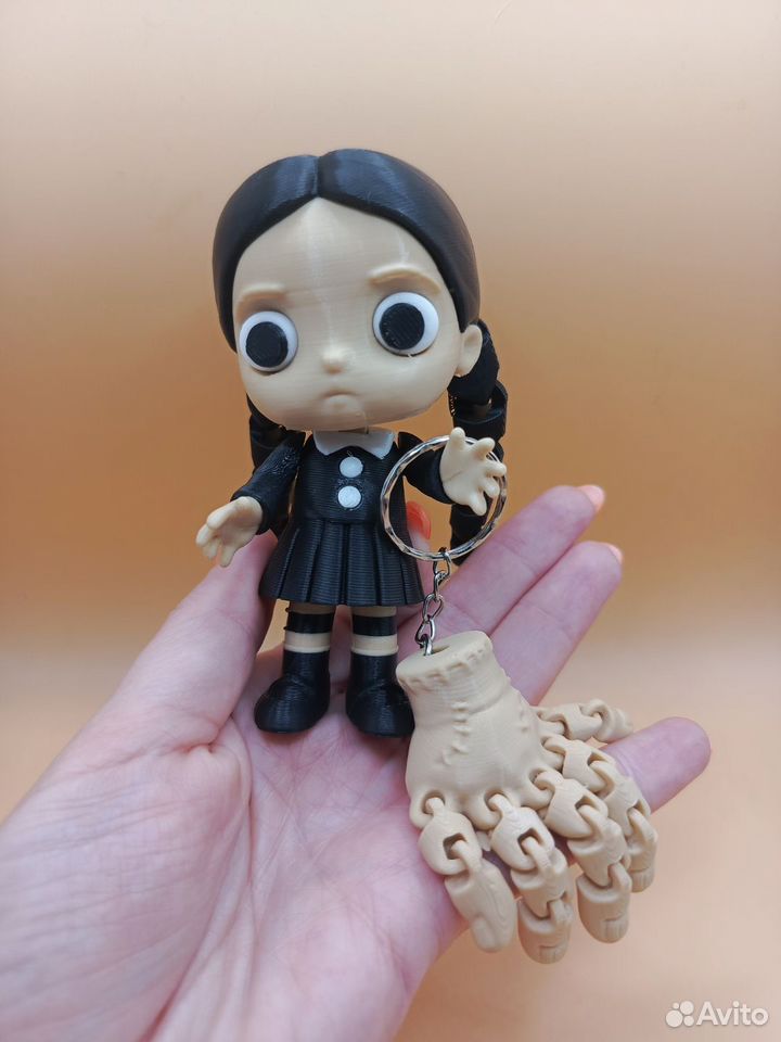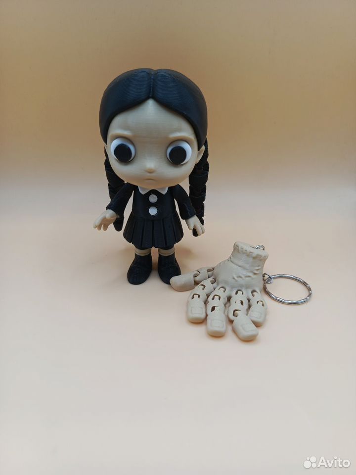 Фигурка Уэнсдей из одноимённого сериала напечатана на 3d принтере из прочного и безопасного пластика. Брелок Вещь в комплекте.