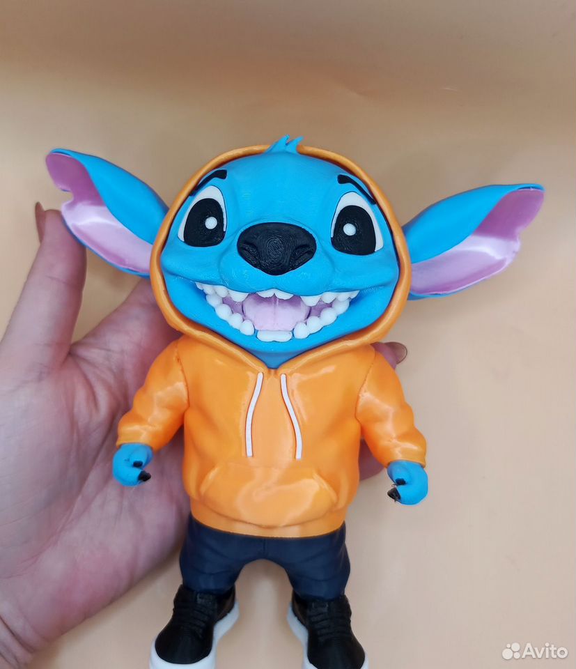 фигурка Стич с худи напечатана на 3d принтере. Худи, брюки и кроссы напечатаем в любом выбранном вами цвете. Высота 14 см.
